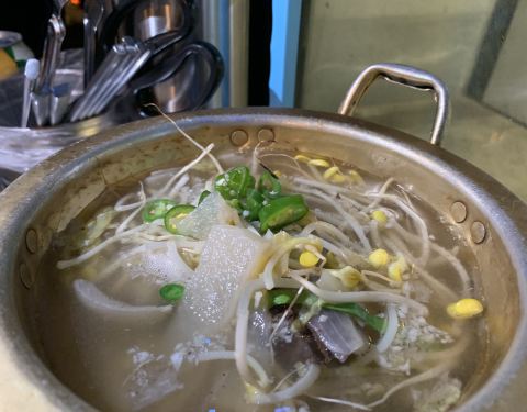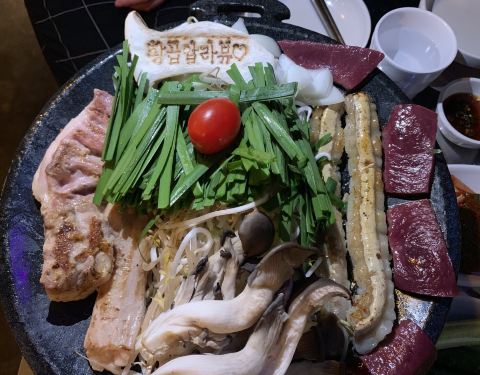 今天又和朋友约了一波烤牛肠,我们点的是烤牛小肠小组,里面有牛心、牛小肠、牛大肠、牛胄胃四个部位,还有韭菜豆芽菌菇土豆等配菜 上来的时候被那个印着店名的杏鲍菇给萌到了~老板好有创意啊!而且老板很贴心地帮我们剪牛肠,自己不用动手就可以享受美味大肠 牛肠被烤得焦黄,吃起来真的好满足,觉得被烤牛肠治愈了 另外我还很喜欢老板送的牛血汤,中国人吃猪血、鸭血比较多,其实牛血也好好吃!牛血比猪血鸭血硬很多,吃起来口感也是很特别的啦! 吃完再逛逛弘大,在附近吃个甜点,完美!