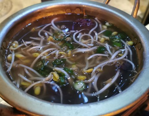 餐厅光线有点暗,走的是酒吧的路线。 刚一落座,就送上一锅的辣豆芽牛血汤,有一块完整的大块牛血。 小金问了度娘,牛血比猪血有营养。 小金和朋友点了两份牛肠拼盘,有肥肠+大肠+小肠+牛心。 没想到丝毫没有异味...