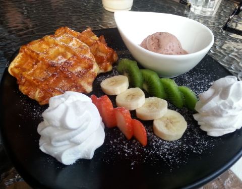 类似的松饼屋 类似的模式 在魔都不少见 正好去思密达一日游 想着可以把这家也扫了 有团购哈 中午前后 店家还没什么人气呢 至少不用排队 可下午的档口 又排到了大门口 好郁闷呐 收银位置 就一个女生 还看她这忙忙 那动动的 十多个人 轮到我半小时都过去了 无聊打发时间的最好方法:wifi 刷网 韩国出品 整个环境和maan 也有的一拼 食物也是 茶包、糖包、搅拌棒、纸巾、茶水 自行获取 选好食物 买好单 凭“震动牌”取食 震动牌有播放视频 其实也挺无趣的 好了 半小时后 我们算是吃上了 ***啊~ 『核桃比利时班特华夫套餐』可配有一款冰激凌 我挑了巧克力 搭配了两块华夫、两坨奶油、草莓、猕猴桃、香蕉切片 奶油好厚 华夫真是。。。能说一炮么 黏连难切 是糖份太多的关系吧 索性切开真真切切看到了核桃 也罢了 『咖啡拿铁』都快放了三分之一的冰块了 牛奶沉底 咖啡飘上 搅拌相融合 我能说冰块影响口感了么