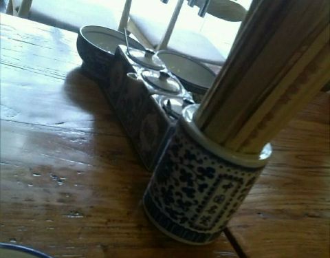 桌子擦拭得比较干净。 桌椅都是木制显露木纹本色。粗瓷青花的餐具,以及调料盒,筷子筒都是青花的