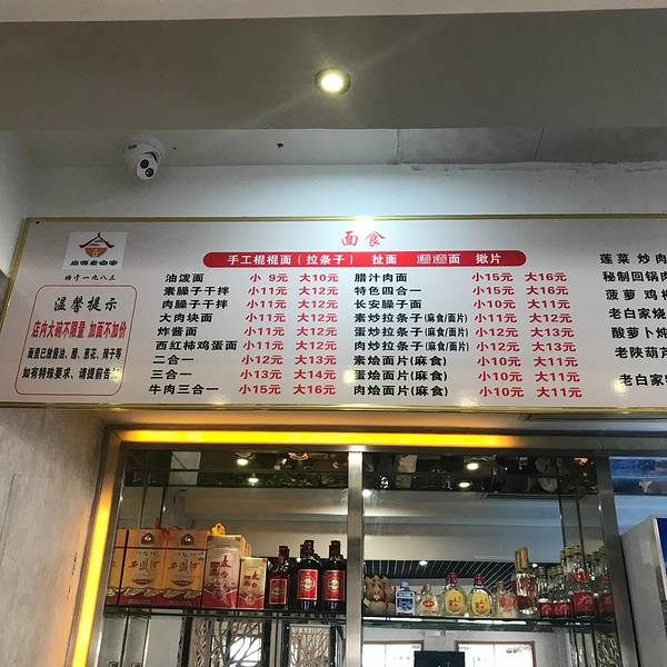 这家店在巷子口,从大唐芙蓉园出来坐公交过去就可以了。 饭点的时候人特别多,加上我们去的那天他家的网络崩了,只能人工点单,排队的人特别多,不过上面的速度还是很快的。 *人均8元。老白家面馆他家的面条,买大碗的话可以免费加面。 而且他家的分量挺大的,建议两个人点一个大碗,如果怕不够吃可以选择免费加面。 *推荐油泼面,油泼辣子超级香!面条附上他家的价目表。 *价格很公道,而且味道也不错。价格表