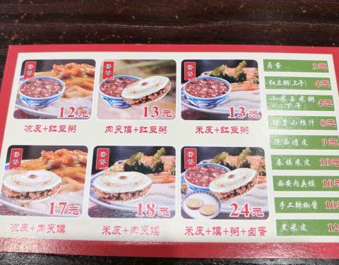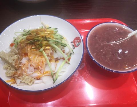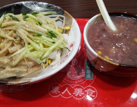 我的没放辣椒和大蒜,红豆粥是没味道的,自己加糖。环境干净整洁。凉皮很好吃,不过冬天吃就很挑战了呵呵。粥的料很足。粥是热的,还要肉夹馍也是热的。配着刚好吃饱,价格不偏不倚能接受。