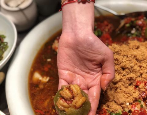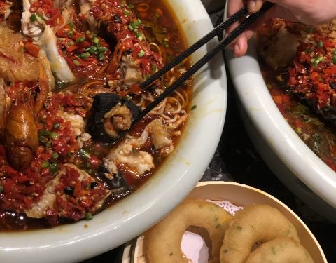 - 一大盆鲜香入味的千岛湖大花鲢鱼剁椒鱼头看着十足壮观,边上绿色的手工饺子分外诱人