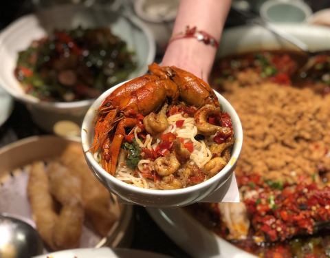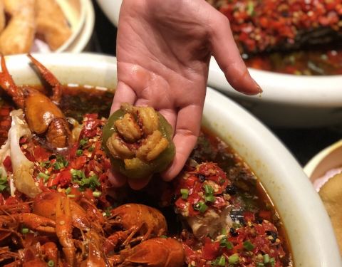 吃过好多次的许爷剁椒鱼头,从没有一次让本人失望过~ 小龙虾的季节到了,许爷也推出了--|小龙虾剁椒鱼头^,本人很爱的二大美食--小龙虾和鱼头,所以岂能错过~ 首点|小龙虾剁椒鱼头^,不管是鱼头还是小龙虾份量很足,小龙虾口味是老长沙味的,在上海并不多见,很好吃~ |许爷剁椒鱼头^鱼头很大,满满的胶原蛋白,女生吃对皮肤也好~ 本人很喜欢许爷的剁椒,很够味,但又不是那种很咸~ 最后用|小龙虾剁椒鱼头^的汤汁,加上几只小龙虾和鱼肉拌面,味道简直一绝,墙裂推荐~ |湖南臭豆腐^这道菜也是特色,满满的湖南味~ 这就是让人意犹未尽的许爷~