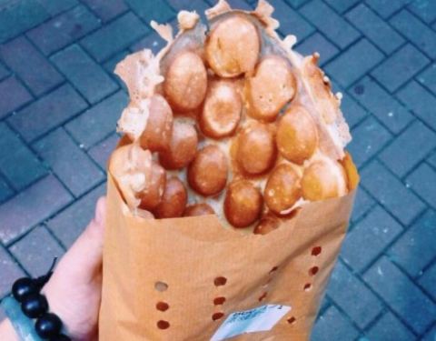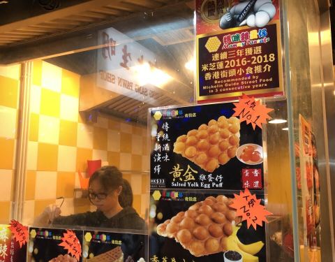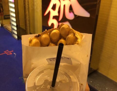 米其林街头小食,慕名而来。 排队的人非常多,等了个把小食才拿到鸡蛋仔。 吃了这家的鸡蛋仔才发现以前吃的是什么鬼。 黄金鸡蛋仔33,非常好吃,鸡蛋仔里面还夹有流沙,而且放冷了还是很好吃。 朱克力鸡蛋仔的巧克力味挺浓的。 走过路过不要错过,值得尝试一下。有好几家分店。 买加饮料的套餐可以减4块,但是饮料一般。 单买鸡蛋仔就行了