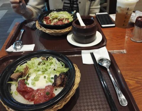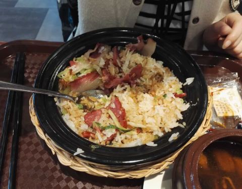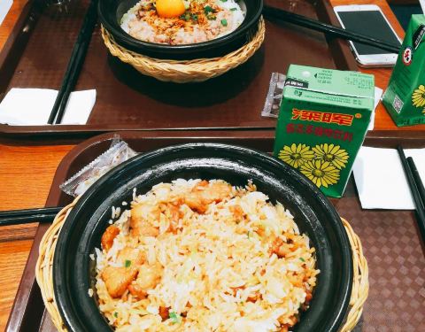 第一次吃煲仔饭,点的排骨饭,感觉很一般。饭有些硬,排骨也很一般,上桌有点慢,不过餐厅环境不错,还有Wi-Fi。晚饭时间去的人不太多,感觉大多是学生。服务员说饭要拌一下才好吃,油和酱油是单包分放的,可以根据自己口味定。饭里都不带辣的,桌上有辣椒可以自己放。