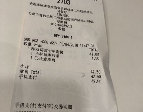 - ...有买麦当劳垫饥了,机场里的麦当劳比外面贵是可以理解滴,这家也有自助点餐,效率杠杠的,服务也不差