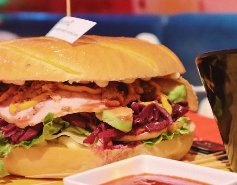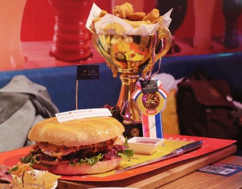 【 排球汉堡 】真的超大size!难怪叫排球汉堡,当然了!更是庆祝咱中国女排夺冠,面包烤制的非常赞,外酥内软,内里是火鸡胸肉,火鸡腿,火鸡香肠,蔬菜牛油果等,一口吃下去,多汁且层次分明。 【 冠军杯 】炸物...