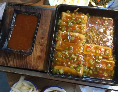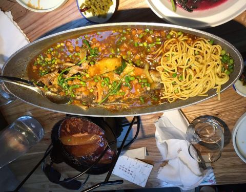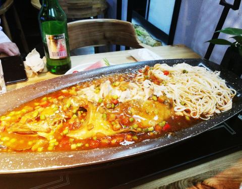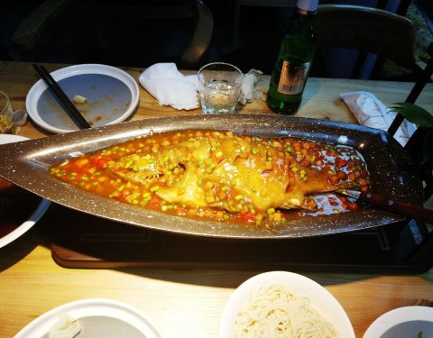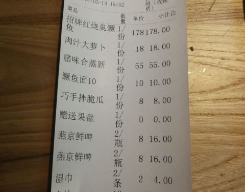 头一次吃臭撅鱼,闻着有臭味,吃着还行,3人要了5个菜,支付宝付款100-8花了313元,菜价有点小贵,服务员态度挺好的,环境还行,有免费的小菜,总体满意。