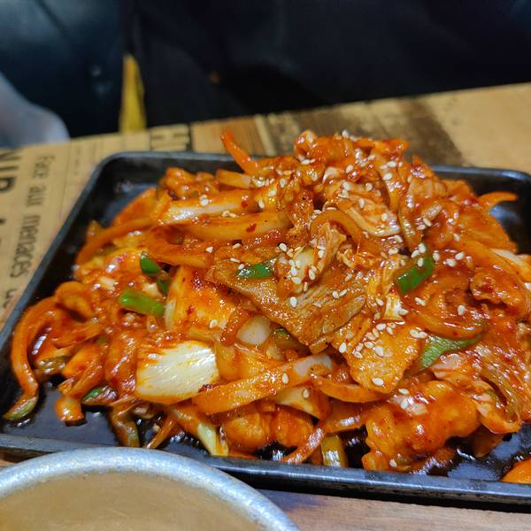 来到店里,在前台扫码排队,然后就窝在门口的沙发上等位,大概40分钟就轮到我们了,铁板鸡、部队火锅是他们的特色。第一次来没经验,一不小心就点多了。强烈推荐的就是吵杂菜和辣白菜,一份铁板牛肉分量巨大!虽然上菜有点慢,但是美味都是值得等待的。