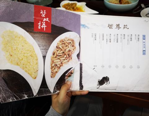 临时起意 一拍即合 年初三正常营业 满心欢喜的去吃蟹宴咯 巨鹿路店 晚上五点已现排队人流 正门边的玻璃窗内 两名师傅正在拆蟹 吸引眼球 拿了号 差不多一刻钟入内了 上下二楼 据说包房设低消 人均1588元 老式洋房 陈旧的桌布和一本几乎翻烂的菜单 有些格格不入 「蟹尊巨无霸」¥888 至尊套餐有蟹粉、蟹黄、蟹膏、蟹柳、蟹钳五小碟 配黄泥螺、泡菜、辣椒酱和醋;先来说蟹 蟹黄&蟹膏最喜欢 满口香浓醇厚 蟹粉稍淡 蟹柳&蟹钳 似乎都用姜醋调了味儿;套餐里另含米饭或面条选其一~每碗都配了白灼大虾和西兰花 选了米饭 可以无限续 是一整碗出品的那种 可惜饭又干又硬的 欠缺了 「蟹粉虾仁大馄饨」¥68 看得见蟹粉 却没吃出蟹粉味儿~虾仁倒是蛮大 饱满鲜嫩又弹牙 如果和其它蟹料理一起 建议先吃这碗馄饨吧 不然更没有存在感 「金汤蟹粉面」¥98 满满的蟹粉盖满面条 配有西兰花和大虾一枚 搅拌均匀 呲溜进嘴里~是因为兜底的关系吗 蟹粉比馄饨有味多了 巨无霸套餐可以多人食 大大降低人均惹~