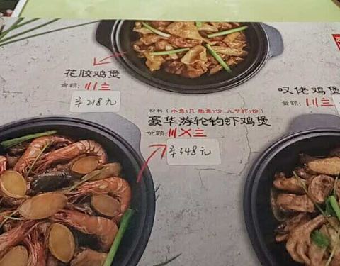 朋友说这家很好吃,之前在芳村,现在江南西也有分店,好在晚上6点去到,晚了就在等位。 菜牌上的价钱那些字,真是不习惯看,一个普通鸡煲要100元+,2-3位用,鲍鱼鸡煲,花胶鸡煲198元,还有其他品种,配菜多数8元...朋友说这家很好吃,之前在芳村,现在江南西也有分店,好在晚上6点去到,晚了就在等位。 菜牌上的价钱那些字,真是不习惯看,一个普通鸡煲要100元+,2-3位用,鲍鱼鸡煲,花胶鸡煲198元,还有其他品种,配菜多数8元,汽水4元一瓶,每桌赠送生菜一碟,鸡煲有点咸,酱汁浓稠,看个人喜欢,份量一般,吃完出来还有人等位。