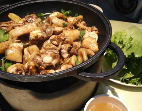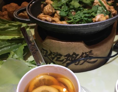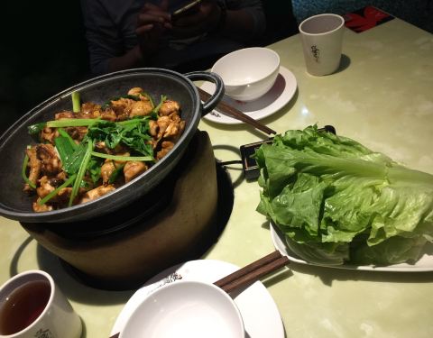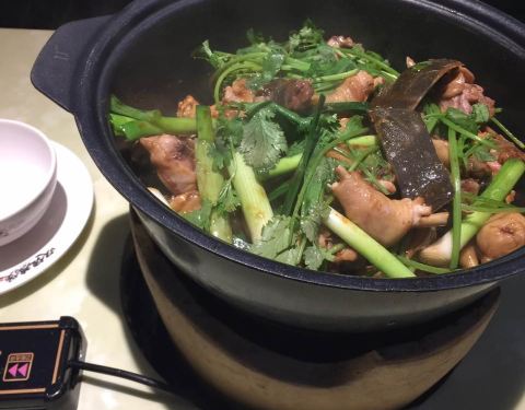 叹佬,整天经过第一次陪朋友来吃,位置坐得不舒服,灯光也处理得不太好,胜在服务员还是满诚恳的,所以也没换位置继续吃了。点了基础的鸡煲,以及青菜、面筋一份。鸡肉是想像中的弹牙爽口,肉质真的很鲜美,与一般在市场自已买的很不同。配上酱汁觉得来一碗白米饭真的不为过,两个吃一份刚刚好,另外点的面筋吃到最后是吸酱汁的,越滚越咸。味道满足,价格比外围农家菜的贵二三十块钱,整体贵上五六十块钱的。会再来