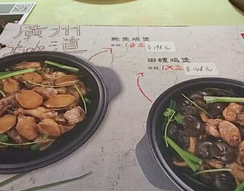 朋友说这家很好吃,之前在芳村,现在江南西也有分店,好在晚上6点去到,晚了就在等位。 菜牌上的价钱那些字,真是不习惯看,一个普通鸡煲要100元+,2-3位用,鲍鱼鸡煲,花胶鸡煲198元,还有其他品种,配菜多数8元...