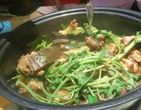 朋友说这家很好吃,之前在芳村,现在江南西也有分店,好在晚上6点去到,晚了就在等位。 菜牌上的价钱那些字,真是不习惯看,一个普通鸡煲要100元+,2-3位用,鲍鱼鸡煲,花胶鸡煲198元,还有其他品种,配菜多数8元,汽水4元一瓶,每桌赠送生菜一碟,鸡煲有点咸,酱汁浓稠,看个人喜欢,份量一般,吃完出来还有人等位。