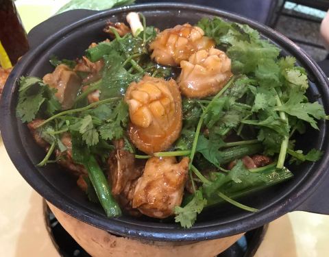芳村鸡煲现在非常的出名,店内食客很多,需要等位。我们点了份鲍鱼鸡煲,一共六只小鲍鱼,一整只鸡,份量很大。煮一会鸡肉就很入味了,鲍鱼也好吃。