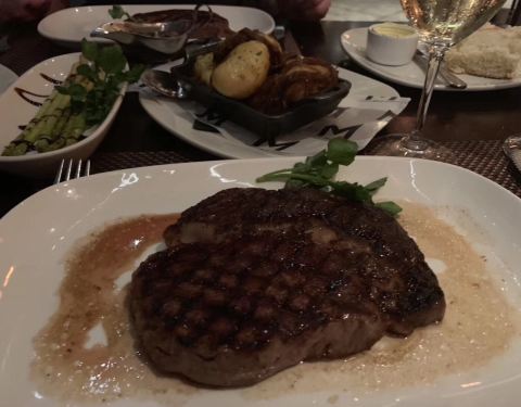 第一次过来和朋友聚餐,没有想到惊喜这么大,这家餐厅评价很高,而且出品服务什么的都很厉害。这家餐厅主打扒,真的是被完全吸引了。餐前面包,味道很香,吃起来不是说一口要下去就完全像棉花糖的感觉,比较有口感,搭配上黄油,味道更加香。开胃菜,魔鬼虾,3只十分厚肉的虾,味道酸酸甜甜,下面配上牛油果,味道不错,果然十分开胃。主食,肉眼扒,要了3成熟,切开,肉汁很多,切开看,里面还是肉色比较红润。土豆泥作为拌碟菜,味道还不错,很绵滑,有一股浓浓的奶香味。甜品是莫尔顿传奇巧克力蛋糕,其实就是巧克力留心蛋糕,一切开,里面的巧克力马上流出来,趁热吃,味道很浓。最后来一杯冰的美式咖啡,完美。最近还有推出春季菜单,下次要试试看其他菜式。这里的出品和服务,环境都十分不错,值得一来。