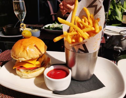 在酒店叫莫尔顿外卖,锯扒就着一次性餐具就没啥气氛了,但是吃个快餐还是OK的,至少比M比K好吃。 牛肉饼有两层,搭配一大盒薯条、女生的话两人吃都够,厚厚的不知道三张还是四张芝士片,味道还不错!感谢文华东方...