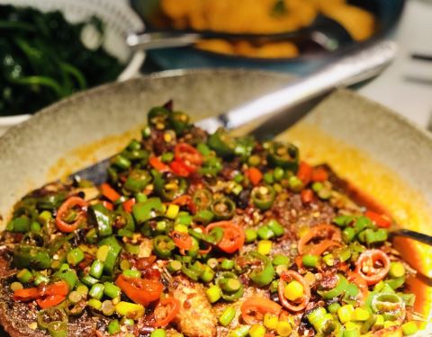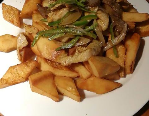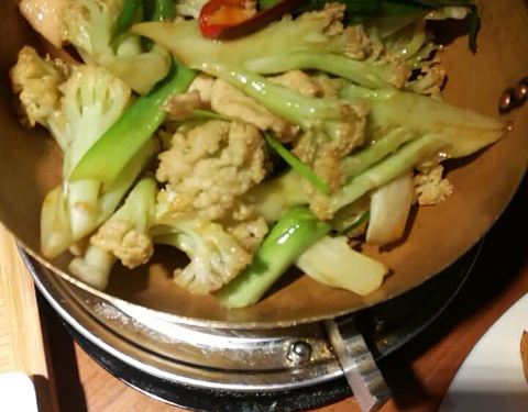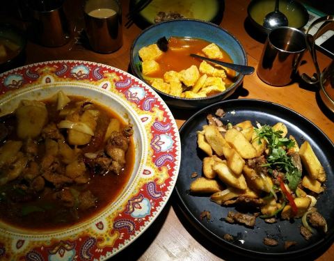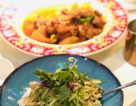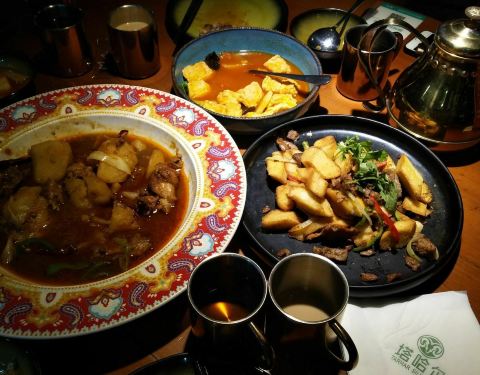 - 大盘鸡土豆很入味,鸡肉有点少,有点太辣,吃完真的是热乎乎。特别是帕芙丽,第一次吃,上面有坚果什么的