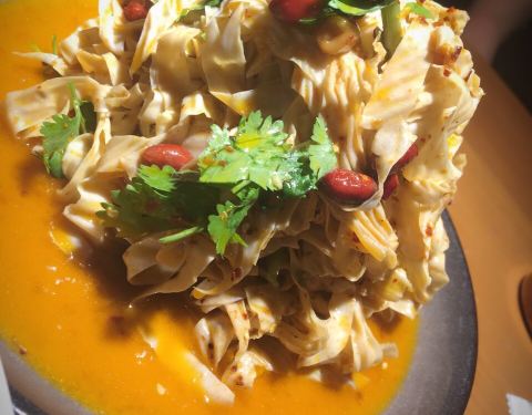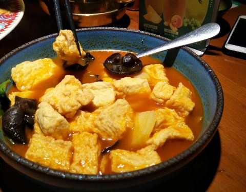大盘鸡色彩鲜艳、爽滑微辣的鸡肉和软糯甜润的土豆,辣中有香、粗中带细,是餐桌上的佳品之选呢,大盘鸡份量足,烩面还是很正宗的,劲道有嚼劲。 酸汤豆腐:豆腐嫩嫩的,配上酸酸的番茄汤,美味到极致! 风味抄囊...