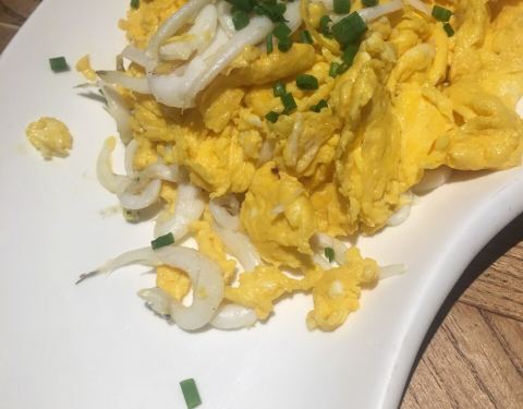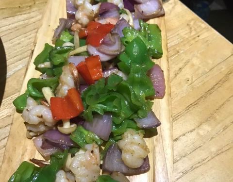 但配上银鱼炒土鸡蛋还是不错的… 虾子炒茭白,茭白块有点大,所以爆炒短时间不是很入味,只能靠调汁来增味