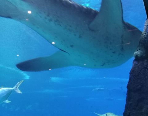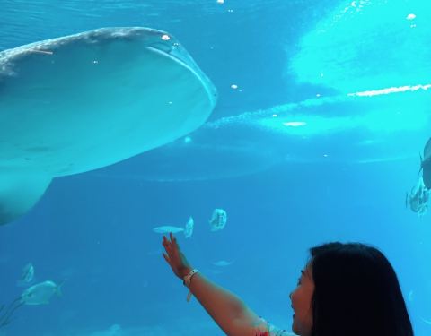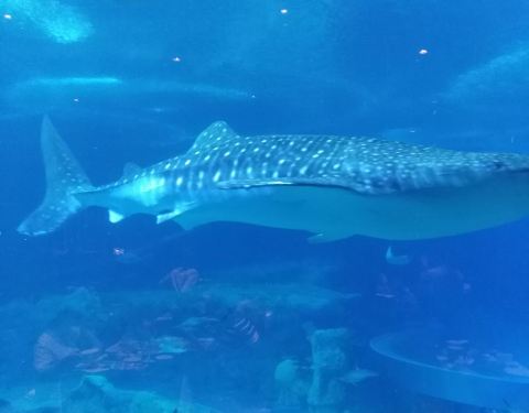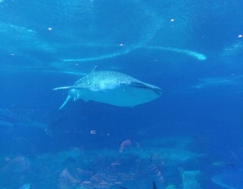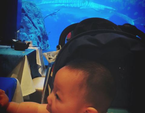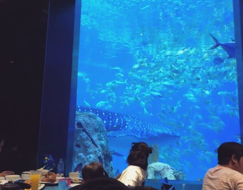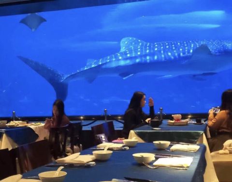 - 但你也可以单点些便宜的,看着鲸鲨游来游去,喝着啤酒,不错,虽然价格有点贵,但是物有所值,可以来试一试
