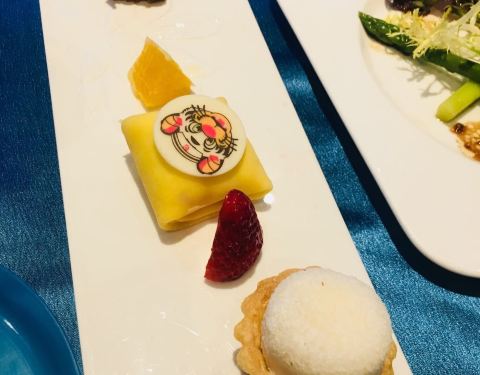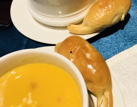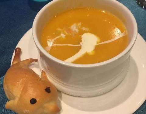 到海洋王国玩,中午我选了这家海底餐厅。一点钟来还要排队。我们选了两个套餐和一个儿童套餐。儿童套餐就冲着甜品上有个卡卡虎巧克力选的。一定要选靠玻璃的旁边坐下。这样可以和鲸鲨合影哦。南瓜汤太淡了。澳洲牛柳煎的太老了。霸王鸡伴罗勒炒菠菜还不错。这家餐厅适合带孩子来。