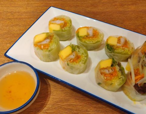 - 芒果鱼柳米纸卷口感很清新,米皮Q弹耐人寻味。鸡扒跟我想象中的不太一样,不过味道也是比较香甜
