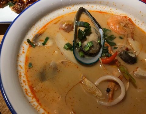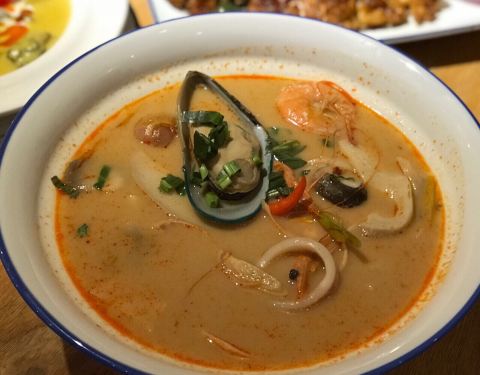阮氏娘越南料理位于世茂商城3楼,清新的蓝色门面。 咖喱牛腩饭,咖喱奶香很重,拌上米饭很好吃,牛肉稍显有点老硬,如果能再嫩一点就好啦。 冬阴功捞檬粉,超大一份,很适合两个人吃,汤头加入了奶,奶甜奶甜的,粉滑滑的,还不错吃。 香茅鸡,香茅味道没有很明显,但是烤的很香,外焦里嫩。 椰丝奶冻,这道超级推荐,奶冻很嫩,吹弹可破。 总体来说还不错,小伙伴说好吃。