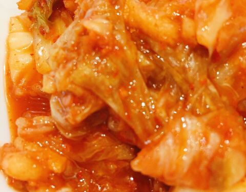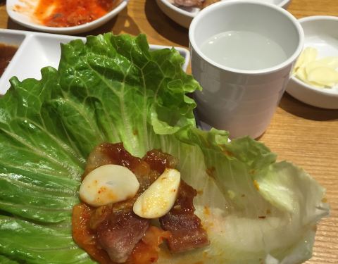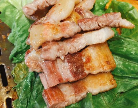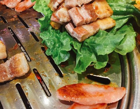 厚实的五花肉整块下去烤,烤得有点点焦嫩,把油脂都逼出来,喜欢夹着一片泡菜,包着生菜一起吃,回味无穷。