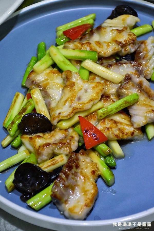 石斑体型大,肉厚,可以熬粥,也可以清炒。今天的龙胆石斑炒芦笋,应该是稍微烫过之后加芦笋大火翻炒而成。色彩搭配,比较清新动人,味道也不错吃。