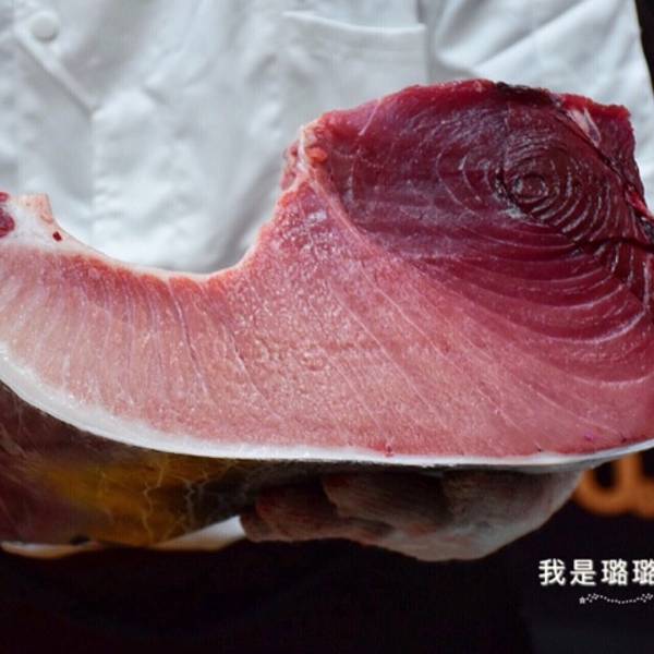 得知位于夏商水产中心的兴旺海鲜城有金枪鱼解体秀,自然不能放过我与金枪鱼本尊第一次亲密接触的机会。 晚上六点海鲜城入口处,华丽而充满仪式感的表演开始。一条重达180斤新鲜空运的蓝鳍金枪鱼展现在大家面前,师傅张开双臂,足有两个臂长! 蓝鳍金枪鱼个头比较大,不同的部位能够取到不同的肉质,所以金枪鱼的解体分为腹部+背部+鱼骨。 手起刀落,分离鱼头鱼尾,将长刀穿进鱼身,切下背部和腹部的鱼柳,整个过程行云流水,这是一种视觉上的享受。 金枪鱼腩是刺身中的黄金,能明显看到脂肪,不同的鱼腩呈现不同的纹理和色泽。靠近前腹部的大脂雪花油脂含量最多,入口即化。靠近中腹的中脂肥而不腻,而颜色最鲜红的赤身鲜味十足,香甜可口,也是食客的最爱。 现杀的金枪鱼,现场品尝才过瘾。大脂鱼肉切得厚薄适中,颜色偏粉白,是鱼肉中最肥美的部位,粘上芥末和酱油,一口塞入口中,就像吃冰淇淋一样在口中融化,香气浓郁。