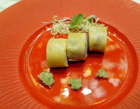其中我最喜欢的是鱼籽酱雪地藏龙以及翡翠金凤凰。前者以火腿海鲜高汤蛋白为底,佐以鲜嫩弹牙的龙虾肉,是清淡高雅而不张扬的鲜甜味,后者则是广东常见姜葱鸡的改良,将鸡肉去骨后裹上鸡皮处理成类似肉卷的形式,中间佐以姜葱,口感嫩滑