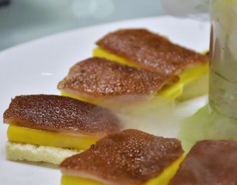 香芒乳猪件多士 烤乳猪取其脆皮,夹上芒果和面包干,特别酥脆的口感。特别适合看电视的时候抱着吃