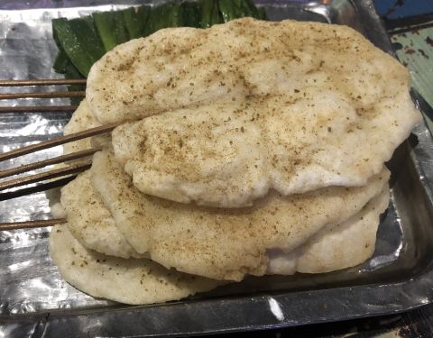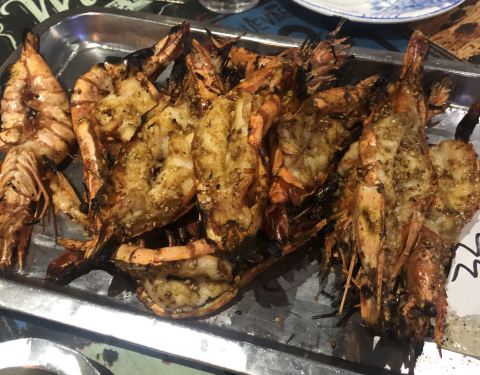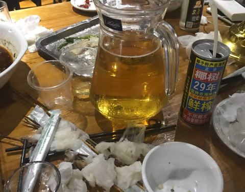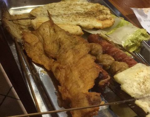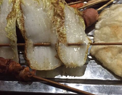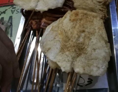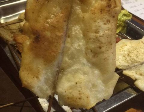 人气不是一般的旺,6点到,店堂里面已经快坐满了。味道很好,就是热热热…… 首推年糕,造型难看了些,但我喜欢,洒些辣椒粉跟好…… 韭菜,考的很嫩…… 还有大虾、鸡翅中、鸡翅尖、牛板筋、茄子、猪脑、贡丸、金针菇、日本豆腐、花甲、猪蹄、面包片