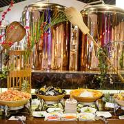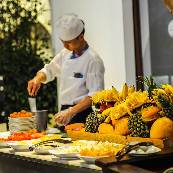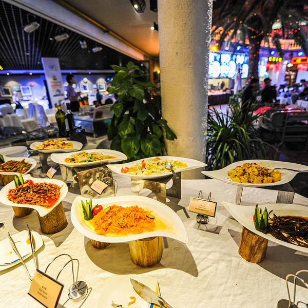 “百花夜宴”位于亚龙湾百花谷的中心位置,每当华灯初上,这里便成为了耀眼的美食演艺餐厅,伴随露天舞台上的臻美歌舞表演,食客们可以尽情享用三亚最具代表的海鲜、香味诱人的巴西烤肉、口感醇厚的自酿啤酒,当然这里也不缺少传统海南菜、水果、甜品等。除了自助取餐,这里的大厨还能根据食材现场烹饪,为食客提供定制般的味蕾盛宴。