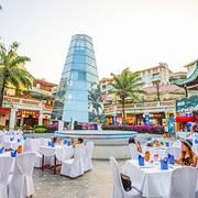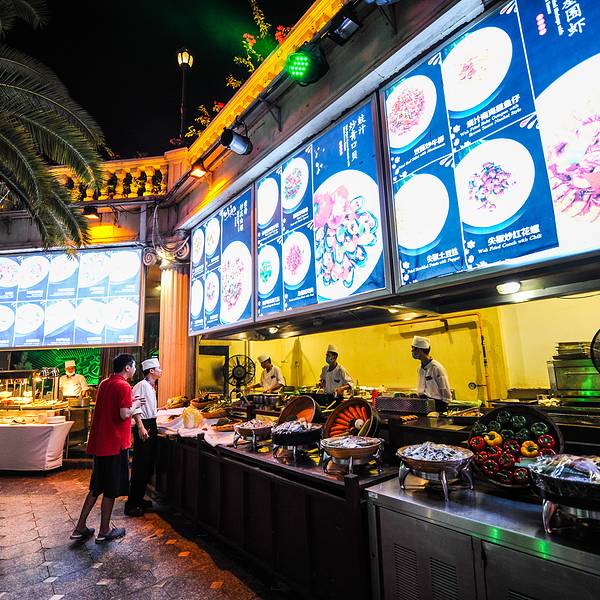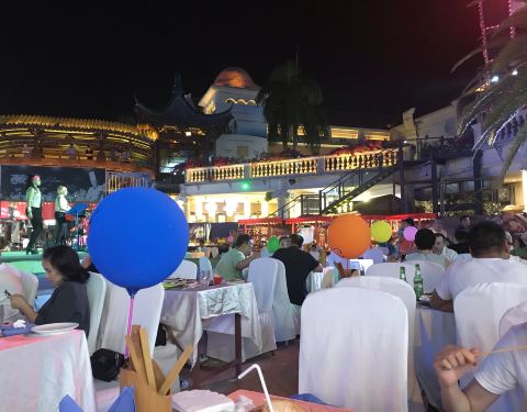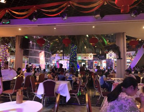 百花夜宴是一家自助餐厅,就在百花谷商业街的中庭,位置十分显眼。自助餐的好处不必多说,就是将各种美食一网打尽,如果是白天在外面玩了一天,累了困了,那么晚上吃一顿自助到扶墙进扶墙出,也是一种享受。很多人会觉得自助餐没特色,不过,百花夜宴还真有。与其他传统的自助餐不同的是,百花夜宴是室外的自助餐,中间有个大舞台,用来表演节目。除了传统的歌舞表演,更多的是可以要求现场观众上台互动,特别是小朋友,玩得不亦乐乎,既然是度假,咱也别怠慢了自家的小宝贝呀,一起嗨起来吧!