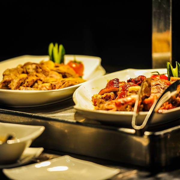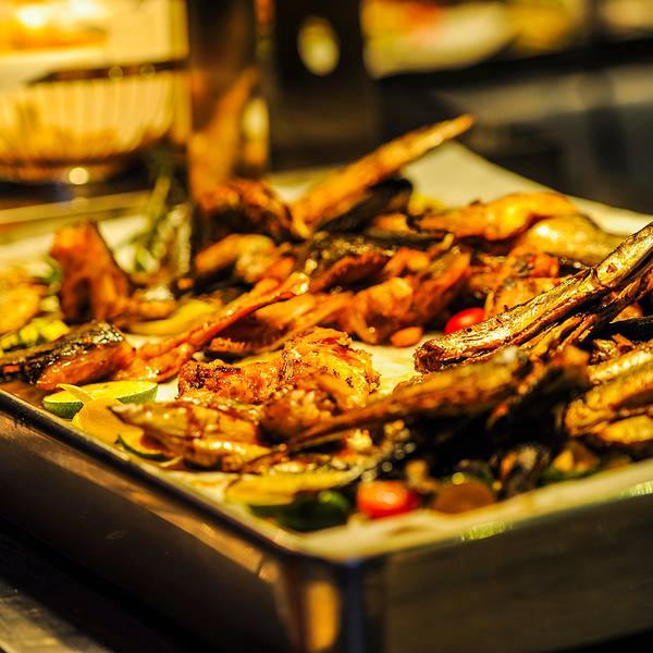 各种海鲜是百花夜宴 中非 常吸引人的部分,而且这里有很多是现炒的菜式,挑选自己喜欢的菜品,就能有服务员记录下来,不一会儿就直接把热辣辣的新鲜美味直接送到桌上。各种冷盘海鲜种类也非常丰富,肥硕的梭子蟹,肉质饱满的雪蟹脚,爽脆的花螺,都能在这里吃到。而且都是十分新鲜的货色,对喜欢海鲜的饕客来说,这些海鲜绝对是让味蕾在瞬间兴奋起来的好东西。