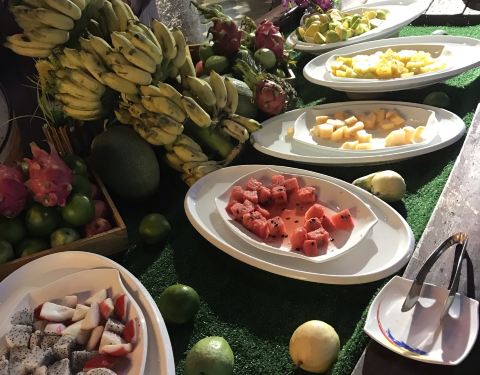 入住亚龙湾华宇度假酒店,白天玩累了懒得动,晚饭就在酒店门口百花夜宴吃的自助餐,就餐是在一个小广场上,饭菜种类丰富,美味可口,中间还有舞台,就餐期间进行唱歌,跳舞等表演,还有陪小朋友做游戏,吹着晚风,吃着美食,欣赏着表演,好不惬意,服务员张琼妹美女服务热情周到,点个赞!