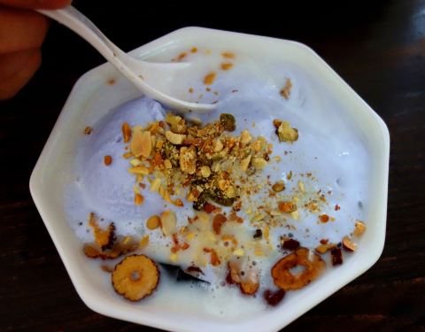 清补凉第一站 「椰奶冰球清补凉」椰奶的味道超棒,配料有14种之多,满满的一大碗,我们是打包的,如果在店里吃味道应该会更好! 「芒果冰球清补凉」冰淇淋是芒果味的,但是和椰奶混合在一起并不好吃! 「香芋冰球...