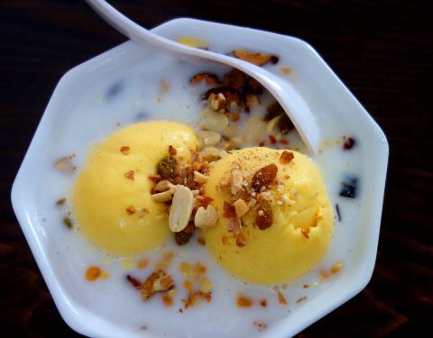 「芒果冰球清补凉」冰淇淋是芒果味的,但是和椰奶混合在一起并不好吃