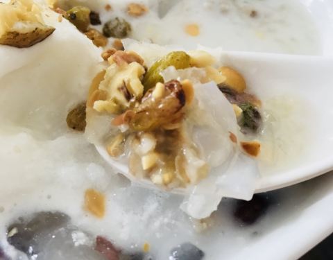 街头的清凉补也吃过,但最好吃的要数郑阿婆家的清凉补。前一天晚上一个人逛第一市场,偶遇了一家郑阿婆,觉得是我吃过的性价比最棒的甜品。于是今天在赶火车之前到了这家顺道的郑阿婆店,给孩子和我各来了一份双球清凉补。带着满满的幸福感,满足感离开三亚。