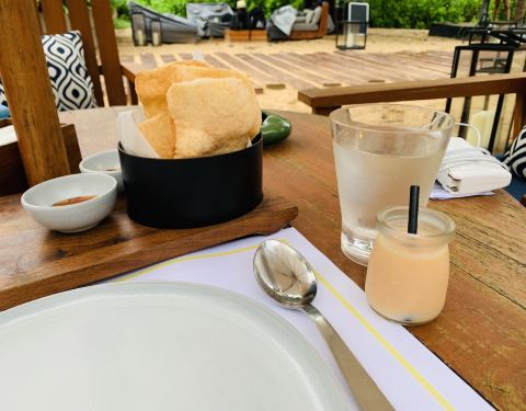 提前预约了艾迪逊酒店的海滩烧烤,万豪金卡会员的话有8.5折的折扣,感觉还是比较划算的,晚上去的时候还没有下雨,所以是坐在沙滩上的,虾片刚刚上还没有吃的时候就下雨了,所以我们就坐到了室内,套餐的话有两个可以选择,但是吃完之后我们发现选择贵的这个套餐反而更划算,套餐的东西感觉不算很多,但是真的吃的话两个人有一点吃不完,量还是比较实在的,贝壳类的品质非常好,只是沙爹串感觉用猪肉做口感上不是非常棒,和在印尼吃的还是有所区别的