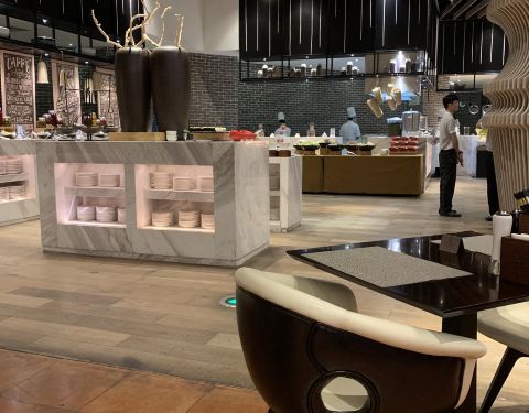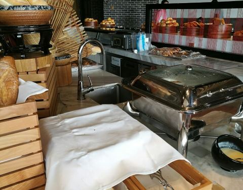住在海棠湾红树林,在这里吃的早餐,人不少,但是挺有秩序~特意开放两个取餐区域域,分散了客流,坐在里面也不用担心吃不到东西~我超级爱他家的面条,各种卤子,比如排骨的,肥肠的~吃了一大碗,满足~餐品种类很丰富了,热菜也挺多,水果很多,而且品质也高~面包蛋糕有点少~总体味道什么都很满意~五星级酒店的早餐水准,就是人比较多~