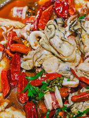 这是升级版的毛血旺:生蚝毛血旺,除了毛血旺基本都有的毛肚、午餐肉、鸭血之外,还加入了生蚝、鱿鱼,尤其是这生蚝真的太鲜美了,正常一份有8个生蚝,也可以另外加,口感还挺不错的~
