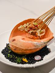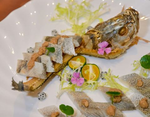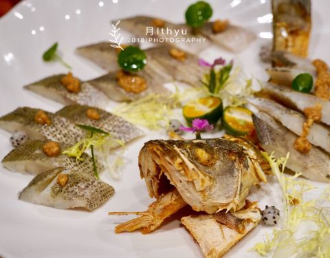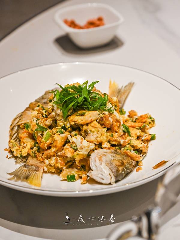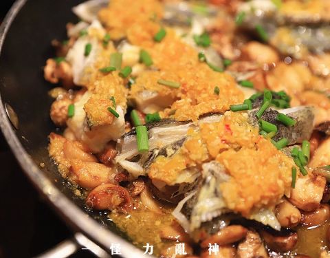 吉祥双鱼这道菜有点创新,是闽南的菜脯蛋搭配黄翅鱼,鱼肉鱼骨拆开分别炸,最后拼凑,一筷菜脯蛋加鱼肉,味道有点鲜美,是一道很下酒的菜品~