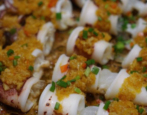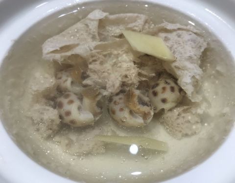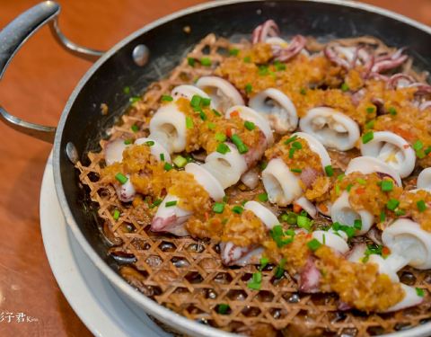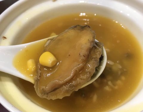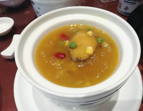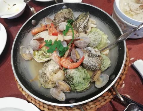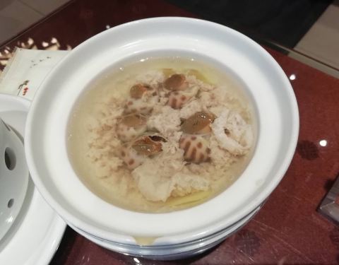 鼎宴南山店,在湖里区禹州新村站,据说这家是老店,还来了一家新店在仙岳路上。之前被朋友一阵夸,打算先尝尝老店。 鼎宴分二层楼,一进门是一个很宽敞的大厅,有几分老厦门大酒楼的模样,一种闽南味道。左边是餐台,师傅统一厨师袍带着白色厨师帽,感觉很专业。再往前是海鲜池区和悬挂墙上的蔬菜区,另一侧墙上是菜单,清楚地标明了价格。转角上二楼,大堂里靠窗是大圆桌,中间是四人桌,看着很档次,另外有VIP包间,需要提前订。 粗粮焗鲍鱼,上来的第一道菜,摆盘精致用心,底下是粗粮,上面是一只个头很大的去壳鲍鱼。鲍鱼鲜嫩有嚼劲,很好吃,粗粮的味道也不错,和鲍鱼搭配一点也不违和。 焗海鱼,鱼有两只,我揭开盖子溢出的满满蒜香,蒜蓉很好的去腥,煮熟的蒜更增加了几分甜味,鱼很新鲜,内脏去得很干净,蒜放了不少,一点也不会偷工减料。 旺螺鲜肉汤,汤很甘甜清冽,旺螺处理得很干净,最主要的是食材要好,之前吃过自助餐的旺螺,不新鲜的其实会产生粘液,它家的还不错,瘦肉不会太柴,已经捣成了肉末。