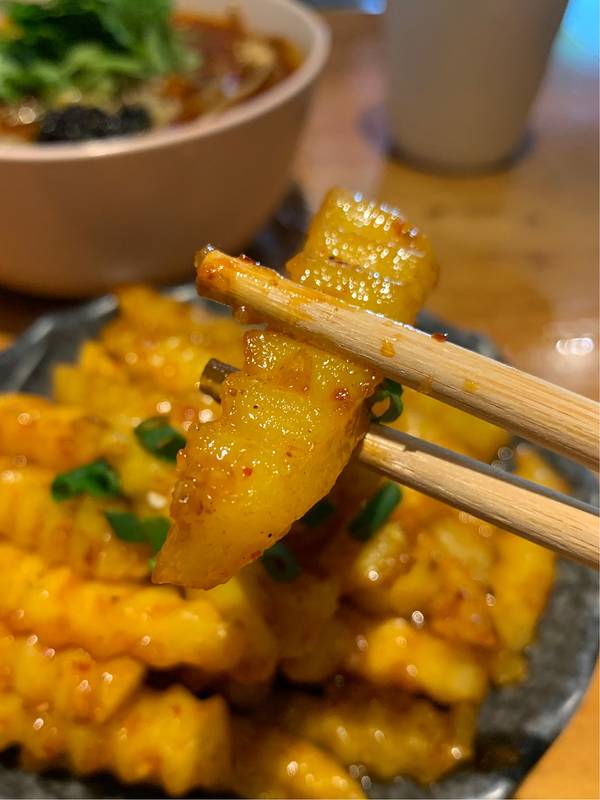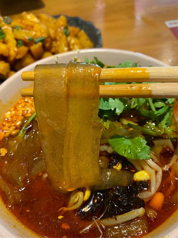 凉粉很好吃口感比凉皮软,酸酸辣辣的很开胃。甜水面惊艳了,甜辣咸香,面比较粗口感比较硬实。酥肉中规中矩,外面的辣椒面很咸。老妈蹄花非常软烂,沾酱吃比较好吃,红糖麻糍外脆里嫩,口感超棒,就是红糖酱太tm甜了,好吃到控制不住。串串真的好辣好辣,主打性价比,下次还要来,真是够辣好吃
