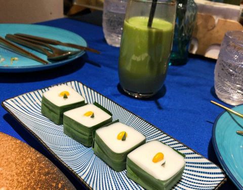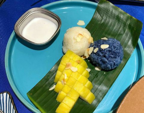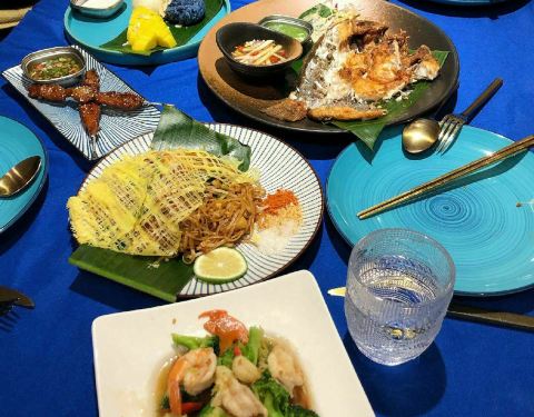 鱼露黄金鱼 海鲈鱼经过鱼露腌制过后再炸成金黄,气味很香,搭配青柠檬酱 蔬菜沙拉,苹果条醋,特别好吃。鱼肉真的很嫩,不会因为炸过而变得很干,外酥里嫩,惊喜的一道菜。 黄金大虾金边粉 里面有三颗很饱满的虾仁,整个粉的味道偏甜,旁边也有蘸料, 可以拌在一起吃,吃起来和干炒牛河有丢丢像,但是偏甜一点。 西兰花炒虾 虾还是挺大只的,但是吃到一只不是很新鲜的虾,比较清淡,可以吃的过程中换个口味吃吃。 曼谷街边烤甜肉串 甜甜的肉串,肉块被炸的酥酥的,还挺好吃的。 泰式沙爹鸡肉串 鸡肉很嫩,表面有咖喱酱的烤炙,然后配有沙爹酱,很东南亚的风味。 椰汁西米布丁 上面是椰汁布丁,吃起来有点像椰子冻的感觉,下面是西米,中间还夹着玉米颗粒,冰冰凉凉的,口感很清新感觉。 双色糯米饭 一半白色的糯米饭,一半蓝色的糯米饭,配有芒果和椰汁。
