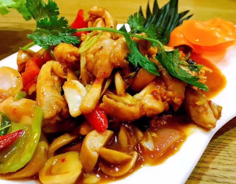 酸辣无骨凤爪 一份酸辣凤爪,一场酸辣味觉的漫长啃嚼。 剔骨后的凤爪,真是懒人的福音,食用非常方便,却又丝毫不影响口感,富含胶质,一口一个嘎嘣脆。味如其名“酸辣”,尺度掌控得非常到位,不是极辣也不是极酸,肉质十分爽脆,也极其入味,绝对是开胃菜的首选,回想起来还会吧唧嘴回味一下。 这道看上去就具有清新春日气息的蔬菜米纸卷,薄如蝉翼的外皮软糯度刚刚好,隔着米皮就能看到里面的大虾仁和多种蔬菜食材,营养十分丰富。那种隐隐约约的粉嫩,仿佛法国美人的薄纱裙,性感却不香艳。吃时蘸点点酱料,清凉适口,回味悠长,在口中产生完美的化学反应。 泰式蒜香炸鸡 伴随着上桌浓浓的蒜香味撩人食欲,这道炸鸡中大蒜的冲味在精心的调和下保留了香味,使炸鸡的味道浓郁而柔和。炸鸡不仅肉质鲜嫩,而且皮保留了原有的质感还带有少许焦脆。一口下去满口的蒜味,却越吃越上瘾,忍不住多吃几口。 咖喱黄炒青蟹,一道吃了连手指都要允干净的美味。鲜美的青蟹肉浸透在咖喱的辛辣中,碰撞出一道美味佳肴。肉质饱满的青蟹饱含着浓郁的咖喱汁,轻啜表面的汤汁,剥出蟹肉,吃的不亦乐乎!过后还满口留香。还很有心地配了几片烤面包片,松脆的面包片蘸上些许咖喱酱,奇妙的搭配带来令人愉悦的味觉体验。加一勺咖喱,拌在米饭里,让醇香的米饭在舌尖跳跃,胃口再次被调动! 香茅炒鸡肉:吃一口,鸡肉中那浓浓的香茅的味道立刻充满口腔,细细咀嚼则能感受到其中非凡的质感,再加上油润的外皮,真是令人欲罢不能! 这道做法奔放肉质嫩滑的香茅烤罗非鱼,口味清香。罗非鱼肉鲜甜少刺,细腻嫩滑,调味料都在鱼皮上,香料、腌制的香料与肉香完美融合,里面的鱼肉十分鲜嫩。 虾仁炒金边粉,咸香可口,金边粉筋道十足,炒后不油腻,清新爽滑。搭配新鲜大虾仁炒制,再以小葱和豆芽提味儿,泰味十足。满足异域口味的同时十分低脂健康。 嫩滑的红豆糕,初尝有沙沙的口感,香甜冰爽,豆味很正,细腻清香,却不甜腻,入口即化。 没有南瓜车,那就来盘南瓜布丁~滑嫩椰奶的口味布丁与软绵的南瓜一起平衡了甘甜与糯粉两种口感。